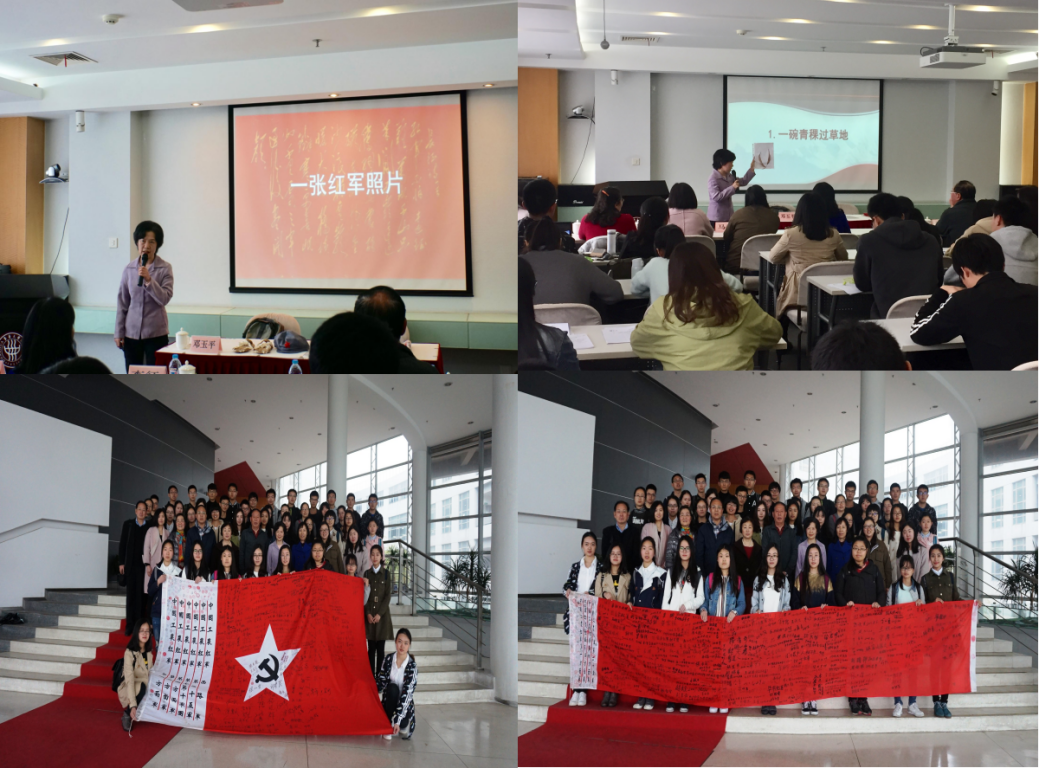 回顾长征历史,走进红军战士,感悟长征精神,传承伟大品质。上海市东方讲坛特聘讲师、12次重走长征路、被誉为“新长征精神代言人”的邓玉平老师以自身重走长征路的经历和感悟来给学员们开展了生动的一课《眺望长征》。邓老师由红军照片、长征时的红军帽、徽章,引入长征的故事,将学员们带入了艰苦卓绝的年代。邓老师详细讲述了长征路线,她本人走过的长征路,她拜访的长征英雄们与长征的故事,从伟大的远征、英勇的红军、永恒的精神三方面解读了长征是一次中国历史、党的历史、甚至全人类历史上的伟大征程。“智勇坚定、排难创新、团结奋斗、不胜不休。”十六字的红军训词更是提醒着每一位学员要勿忘历史,奋勇前行,也再一次印证了长征精神的现实意义依旧突出。邓老师向同学们展示了一面签满了红军老战士们名字的旗帜,生动的讲解真正让同学们认识到长征不仅仅是知识,而是实实在在的存在,长征路是一座红军战士用青春热血铸就的露天的历史博物馆。“长征精神,心中永存”,在永恒的精神中感受到了党的力量,激励着每个学员不忘初心、砥砺前行,认真学习党章党史,在今后的学习生活中,不断努力,积极向党组织靠拢,为建设国家贡献自己的力量。
