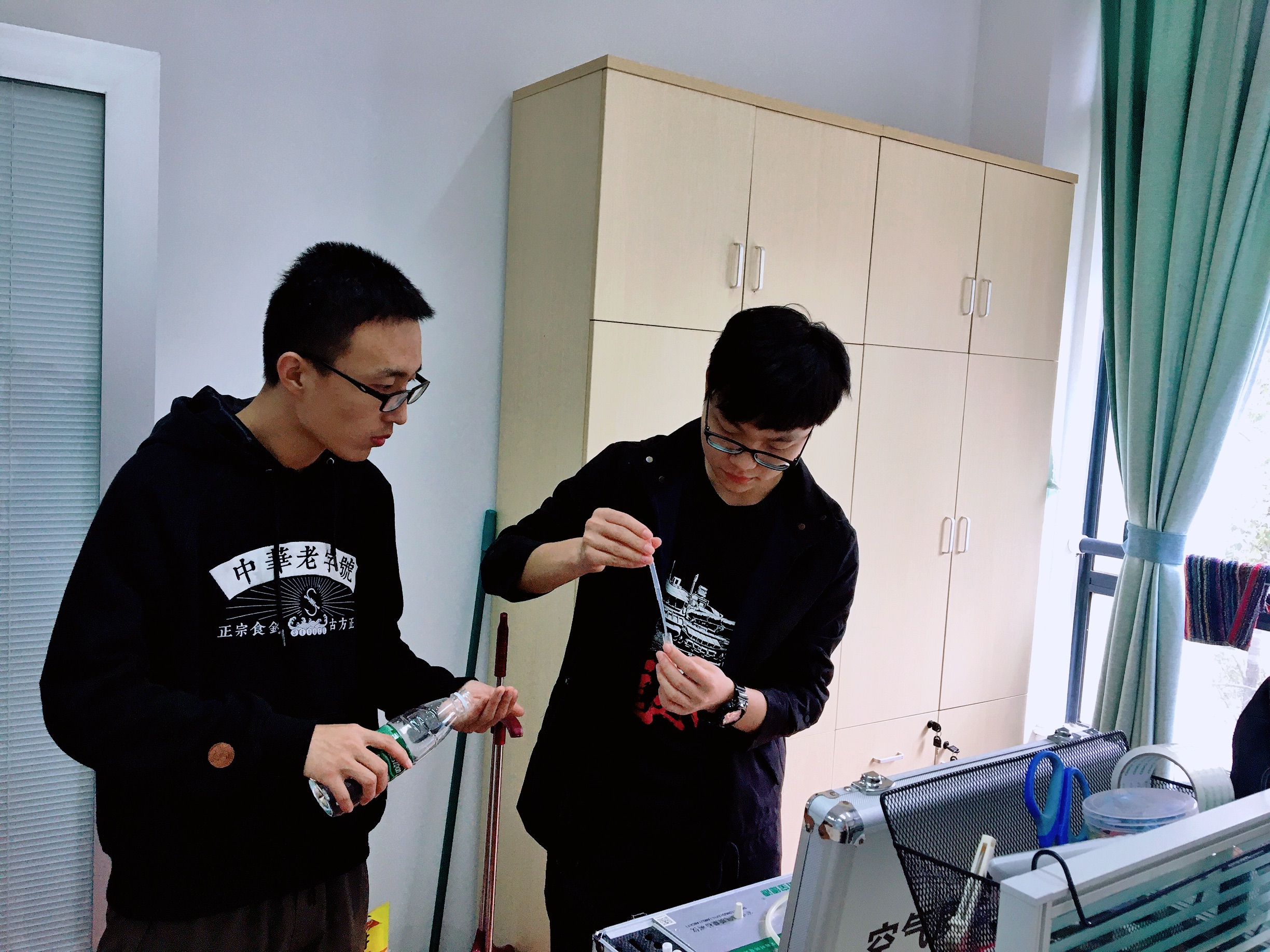 11月17日上午,第二组的党员检测了公司楼3136蔡老师的办公室和1156、3131等,蔡老师对我们的活动表示支持和肯定,并一起耐心地等待检测结果,建议在不同的时间段测量并对其他实验室也进行测量,好让同学们学习安心,老师上班放心。由于实验室近期有购置新用具和设备,检测结果发现1156的甲醛浓度超标,韩逸飞向所在实验室的同学提出开窗通风、购置活性炭的建议。