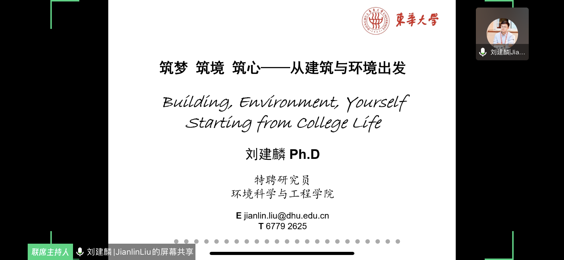 刘建允老师精心筹备,带来《从科创实践中培养工匠精神》主题讲座,带领同学们充分了解环境科学与工程专业发展地位以及未来发展动向,通过介绍国内外的环境专业发展,帮助同学们认识到专业多学科交叉融合的特点。在讲座的最后刘建允老师鼓励同学们把握机遇,砥砺前行,通过培养创新人格、建立充满创新活力的高效知识结构来使自己精益求进、扬长避短,从而练就工匠本领。刘建麟老师以自身的科研经历切入,带来《筑梦,筑境,筑心——从建筑与环境出发》主题讲座,通过科研实例呈现了专业的多面发展潜力,讲座精心设计且内容丰富。在提问环节中,与杨自力老师一同分享专业未来发展,与同学们在线上互动答疑,鼓励大家深入学术钻研,详细又耐心的讲解使得同学们对本专业有了深入的认识。