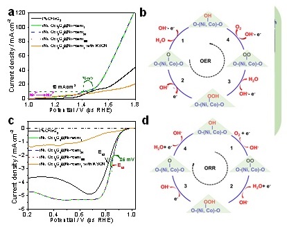 (图2 (a)催化剂ORR活性对比及其 (b) ORR反应机制;(c)催化剂OER活性对比及其 (d) OER反应机制)