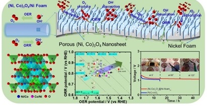乔锦丽教授课题组针对以上方面开展了相关研究,通过一种简单稳定的电沉积-电化学原位氧化耦合法,实现了镍原子掺杂的Co3O4纳米片阵列在泡沫镍表面的原位生长,制备出一种无碳、无粘结剂的柔性双功能空气电极。该电极不仅具备了泡沫镍的高导电性、丰富气体传输通道以及强机械强度等固有优势,同时协同了(Ni, Co)3O4材料的ORR和OER催化性能。同时,该工作采用SCN-离子作为分子探针,有效揭示了柔性氧电极的活性位点及其催化机制,并由密度泛函理论(DFT)进一步验证。基于以上特性,该双功能柔性电极表现出优异的催化活性以及电池性能,其能量密度高达2268 mWh/cm3。