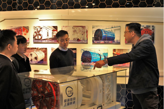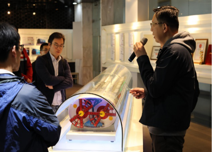 本次参观分为三部分:盾构展厅、装备车间和掘进试验室。首先在盾构展厅,工作人员详细介绍了机械制造分公司的历史沿革,包括早期应用于上海打浦路越江隧道的网格式盾构、国内首次研制的土压平衡盾构、双刀盘可更换驱动复合式盾构以及应用于上海地铁14号线静安寺车站建设的矩形顶管机。