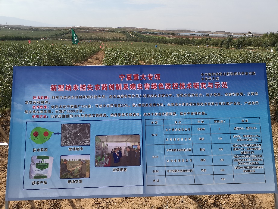 The program focused on the key problems of Ningxia's dominant crops with high incidence and hard control of diseases and insects and high dosage but low efficiency of pesticide application. This project has developed and upgraded the Ningxia special pesticide nano-lost controlling agentia, which has been used on a total area of 0.404 km2 on wolfberry and vegetables. As a result, the application of agentia reduced pesticide consumption by more than 20% and increased pesticide utilization rate by 15% under stable conditions, which can provide effective scientific and technological support for high-quality agricultural development and reduction of agricultural non-point source pollution in Ningxia. This technology is favored by local farmers and large growers.
