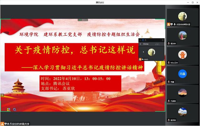 突如其来的新冠疫情打乱了生活节奏,特殊情况下,如何在抗疫工作一线让党旗高高飘扬?4月10日下午,环境公司建环系党支部在线召开疫情防控专题组织生活会,组织学习相关指示精神,号召党员发挥先锋模范作用,扛起特殊责任,拿出特殊担当。公司党委副书记宋新山同志、王丽华同志以及支部全体党员教师参加了会议,会议由支部书记苏亚欣主持。