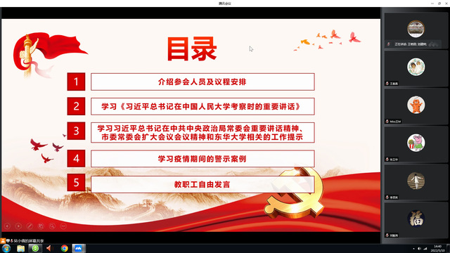 为深入学习贯彻习近平总书记的重要讲话精神,环境公司组室党支部于5月10日通过线上会议形式组织部门教职工开展政治理论学习,旨在统一思想,坚定信心,抓好疫情防控,筑牢抗疫防线,加强疫情期间师德师风建设。会议由支部组织委员王艳丽老师主持。