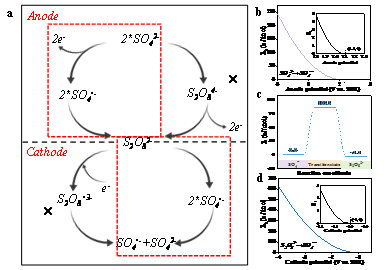 该研究报道了一种流体双极电化学靶向诱导硫酸根自由基(SO4•–)的策略,仅利用水中普遍存在的硫酸根阴离子(SO42–),通过构筑流体双极电化学系统来实现水中典型微污染物的超快净化。这种先进的废水处理理念不需要化学品的额外添加,仅通过有限电能的消耗即可实现SO4•–的靶向诱导生成,并随后再次产生SO42–,实现了SO42–在整个反应体系内的循环,与之同时发生的是系统内污染物的高效降解。本研究开展了穿透式体系构筑原理、SO4•–生成与调控机制、污染物去除效能与规律等研究。这项工作为有机污染物的治理提供了基于催化氧化、电化学和微滤技术的高效集成体系。
