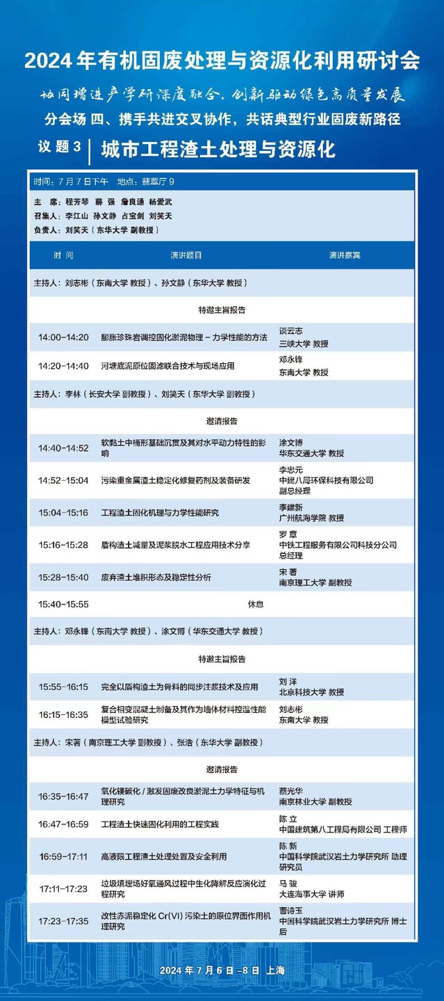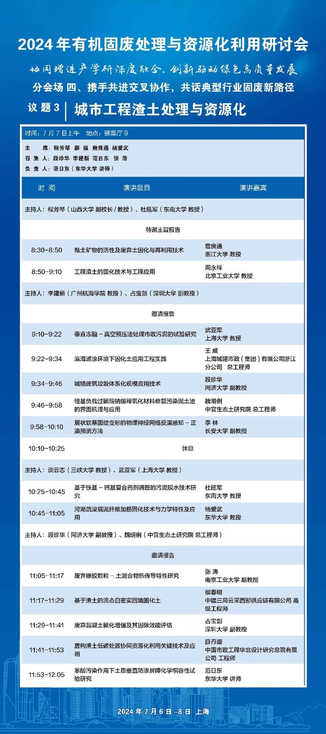 2024年7月7日,全国有机固废处理与资源化利用研讨会——议题三:城市工程渣土处理与资源化在上海举行,本次议题由必一运动体育公司、山西大学、中国科公司武汉岩土力学研究所、浙江大学共同召集,必一运动体育公司土木工程系承办。